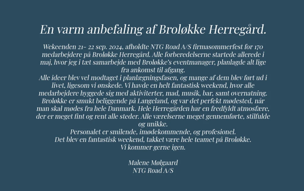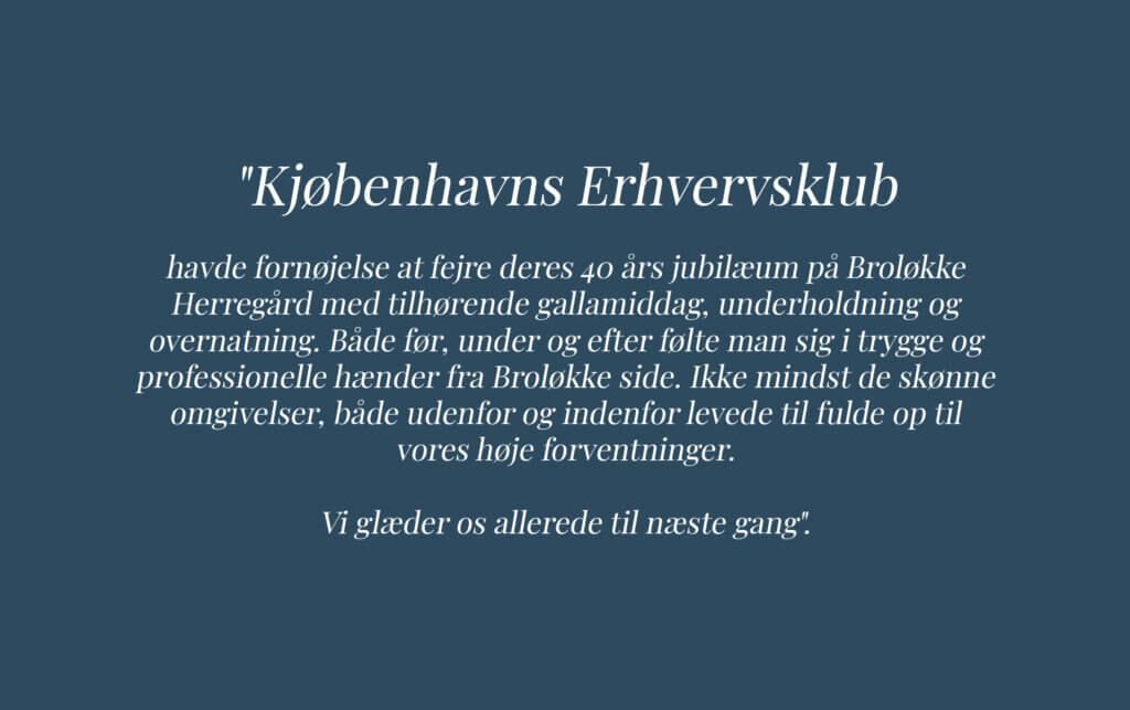 På Broløkke Herregård kan I forvente en skræddersyet mødeplanlægning og -rådgivning, der tilpasses jeres specifikke behov og ønsker. Vi byder jer velkommen med personlig og professionel service i vores eksklusive og unikke mødelokaler, som er perfekte til både store og små arrangementer. Uanset om det drejer sig om en konference eller et firmaevent, er vi sikre på, at vi kan skabe en oplevelse, der er skræddersyet til jer.