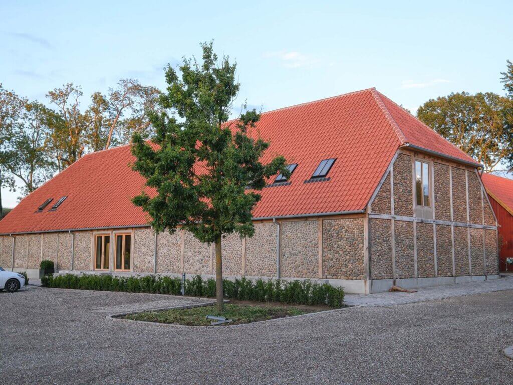 Selvom bygningen er helt nyopført, har vi holdt fast i fortællingen om stedet. Vi har ladet os fortælle, at der engang stod en bygning netop her, bygget i kampesten. Den historie ville vi gerne ære, og derfor har vi valgt at beklæde facaden med halverede pigsten, hentet i Nordjylland. Resultatet er et hus, der føles, som om det altid har hørt til.