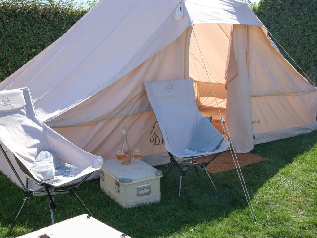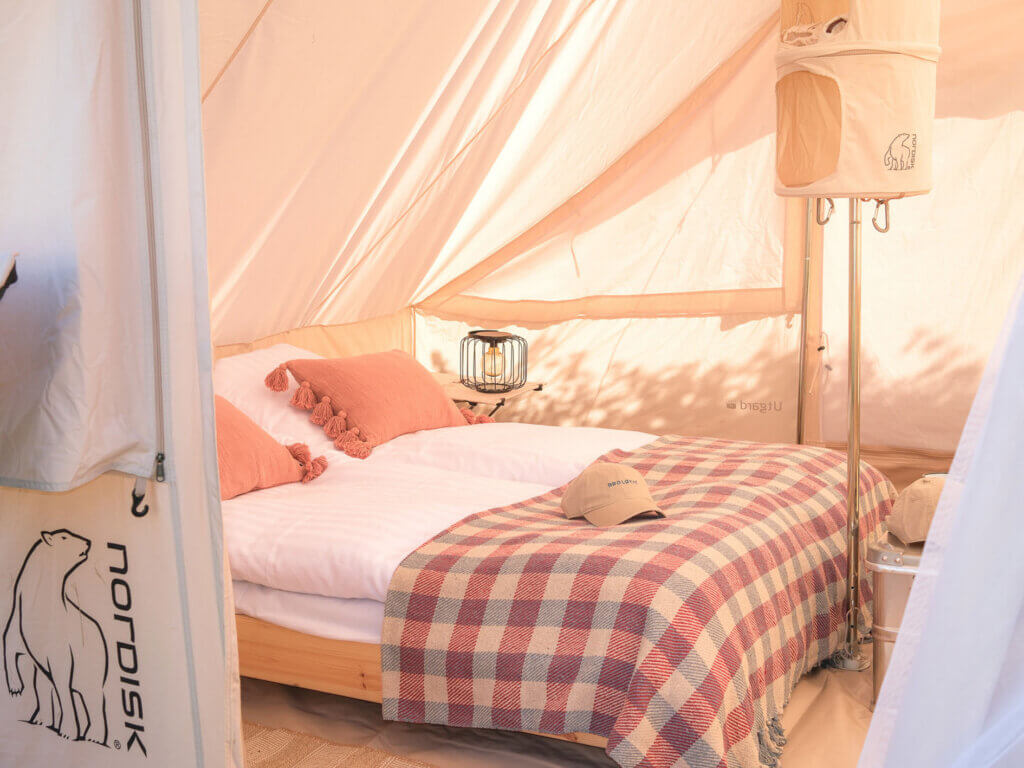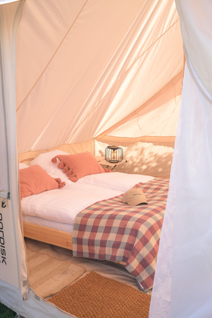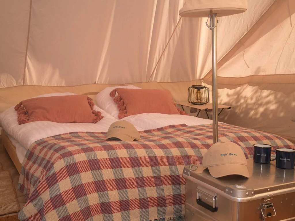 Overnatning fra fredag d. 4. september til søndag d. 6. september i luksuriøs glamping-telt for 2 personer. Teltet er udstyret med dobbeltseng i træ (200×160), premium dyner og puder, luksussengetøj, håndklæder, gulvtæpper, opbevarings-boks, 2 stole og 1 bord, lamper og plaider. I hvert telt finder I desuden 2 Broløkke caps og 2 emaljekrus, der understreger den unikke campoplevelse – og giver jer mulighed for at tage minderne med hjem.