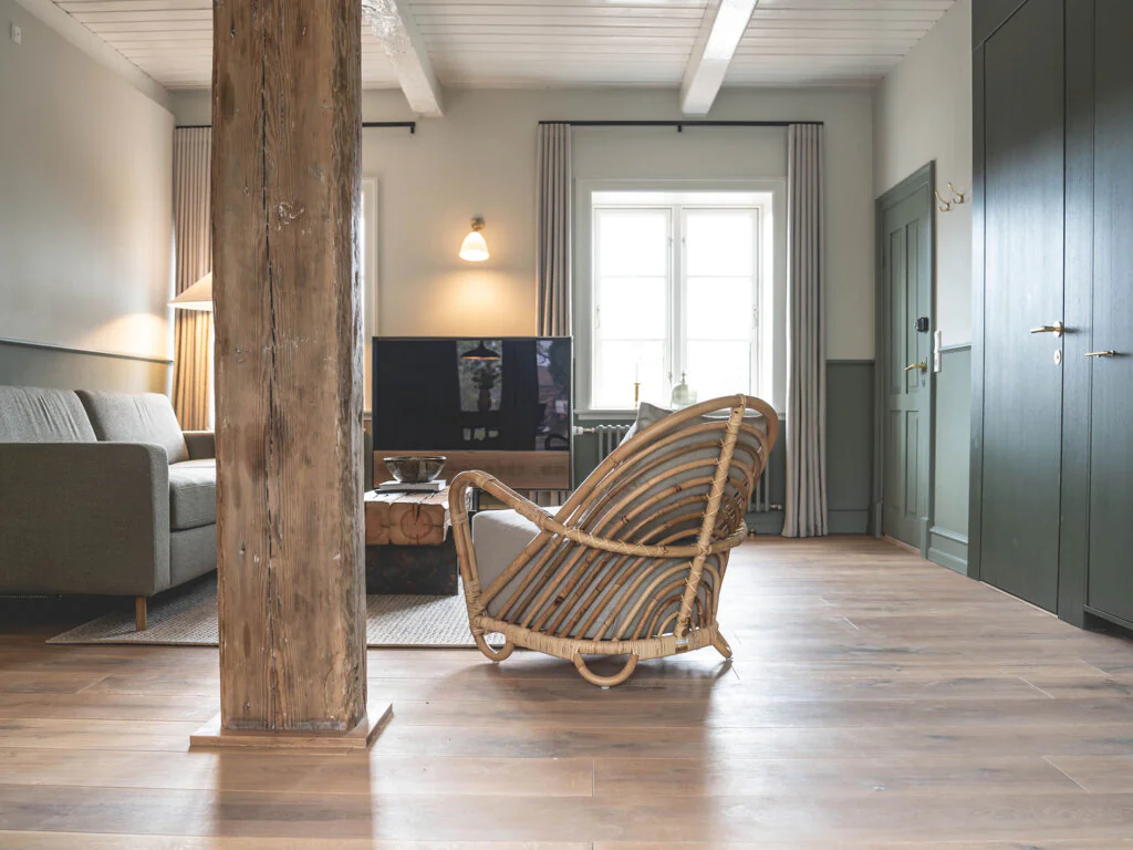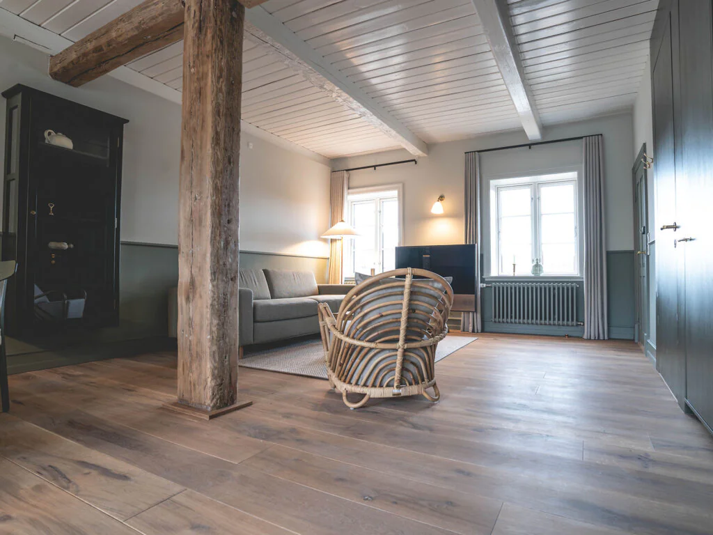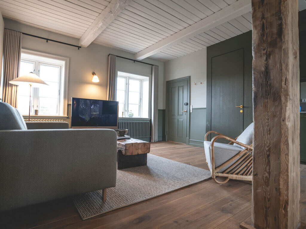 Den gamle Forvalterbolig er nu omdannet til lejligheder, som alle har egen privat terrasse med udsigt til græsarealer og marker. De har alle opholdsrum, med sofa og spisebord samt et fuldt udstyret og funktionelt snedker køkken. Der er to badeværelser – et i stueplan og et på førstesal. Herudover er der 2 til 3 separate soveværelser med to dobbeltsenge, der kan skilles ad.